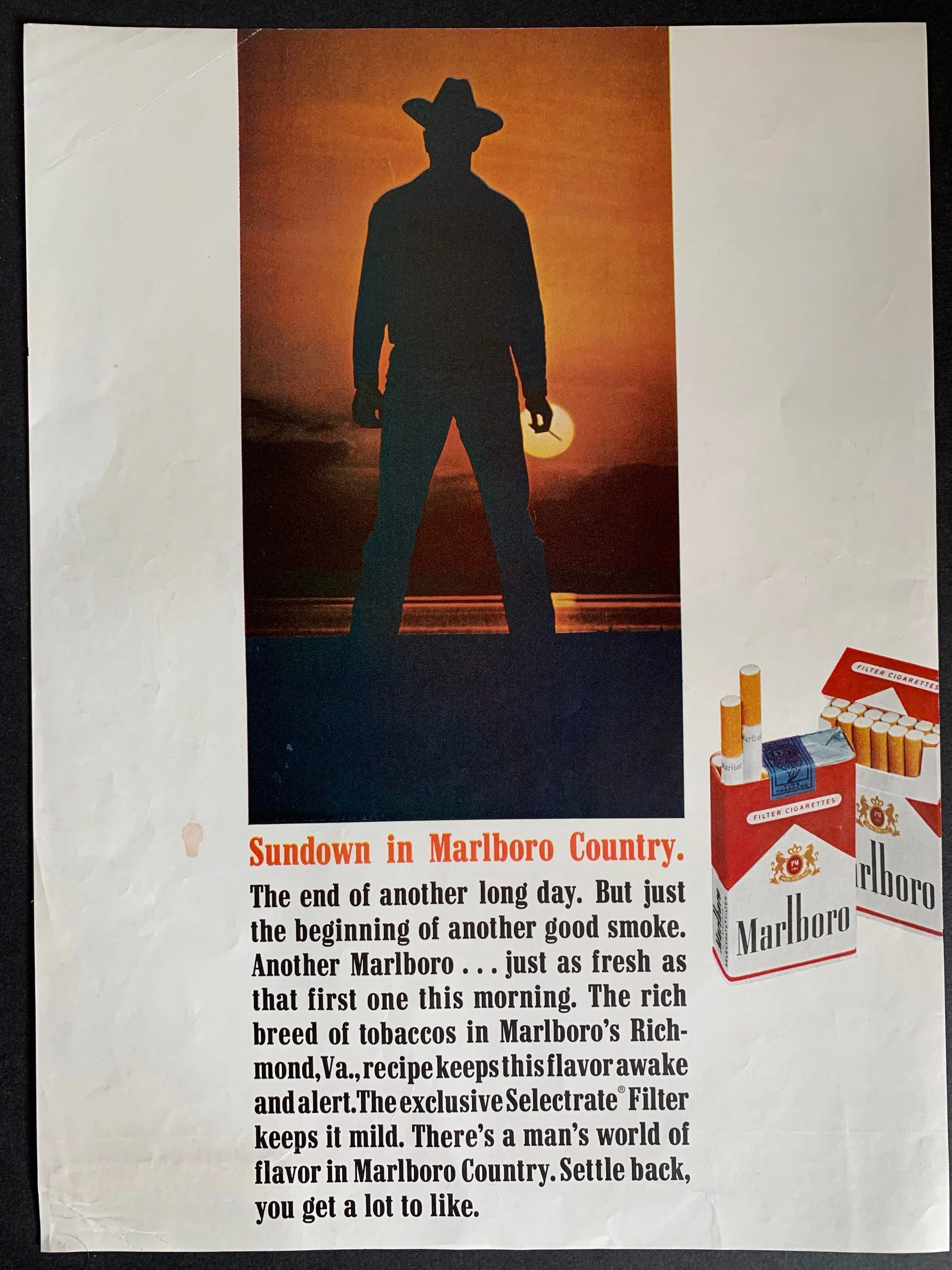 Set against the sweeping backdrop of the American West, the Marlboro Man strode through vast, untamed landscapes—alone, unbothered, elemental. He was rugged and self-reliant, often pictured on horseback, rounding up cattle or lighting a cigarette at dusk. These images were carefully constructed to evoke not just masculinity, but myth.